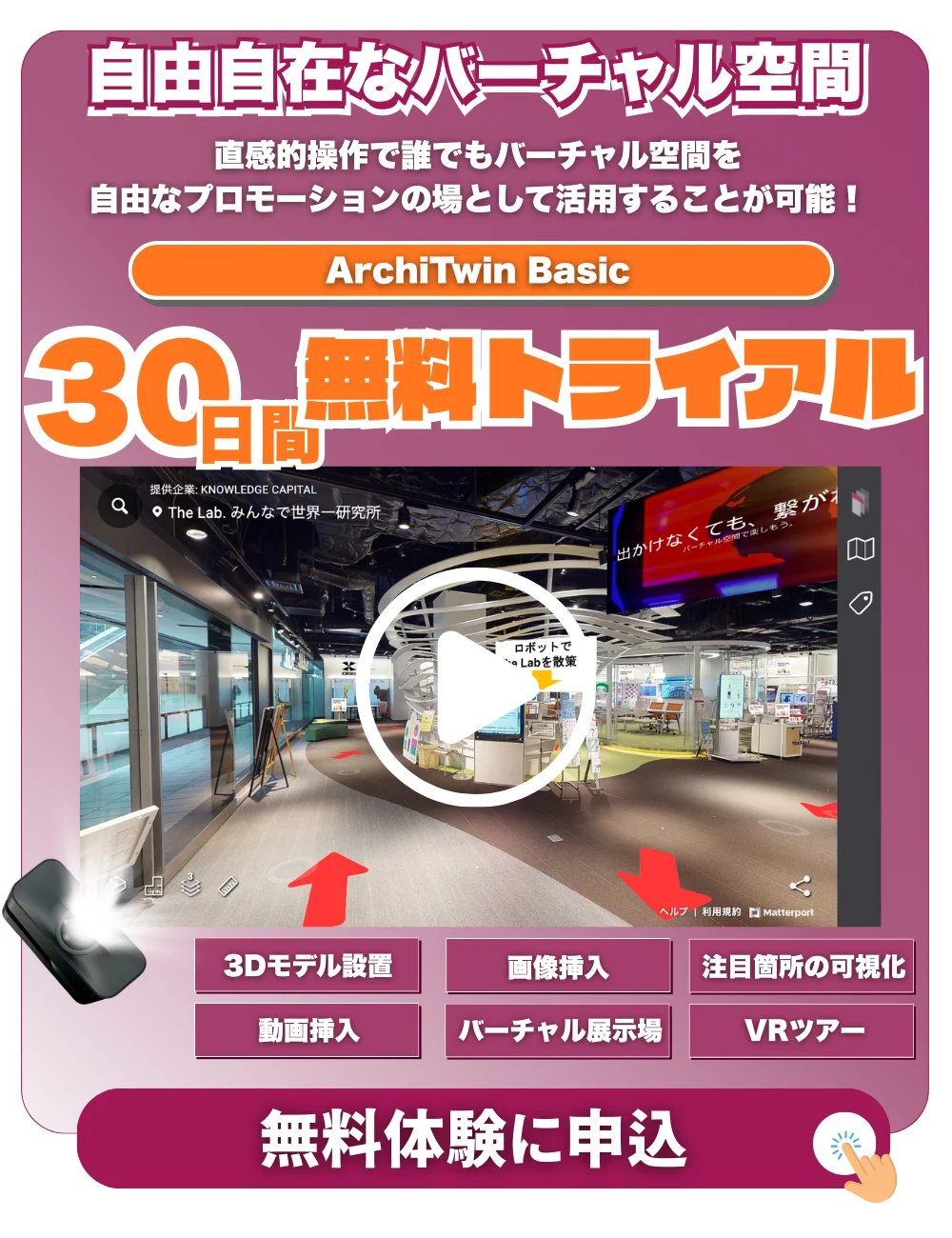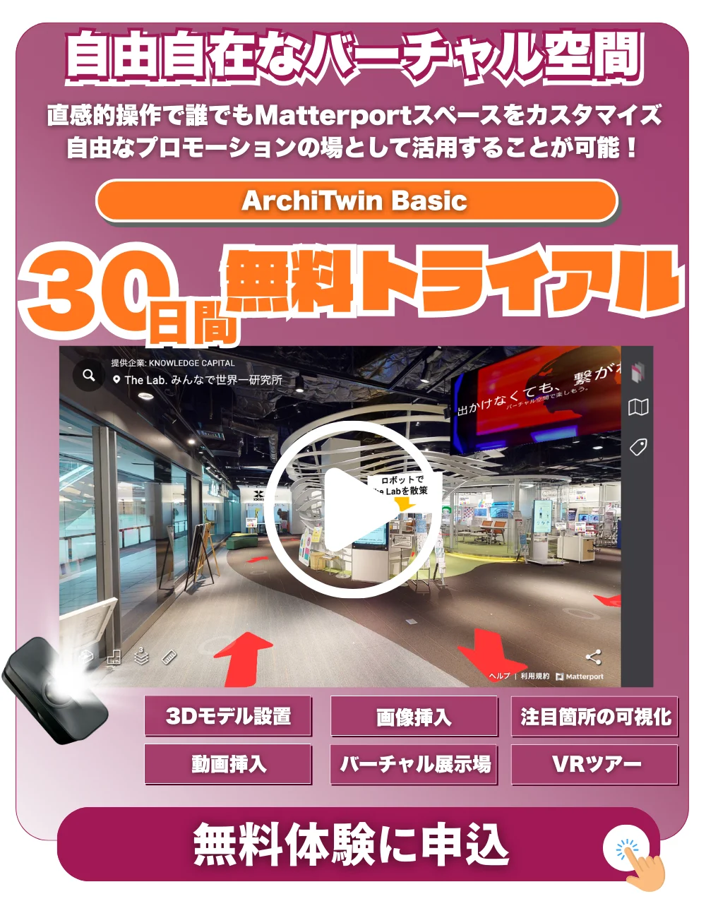 動画の再生や配置された画像や3Dオブジェクトなど、ArchiTwinで生成した3D空間をまずは体験してください。